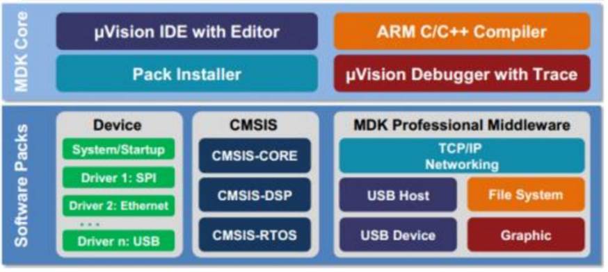MDK 源自德國(guó)的 KEIL 公司,是 RealView MDK 的簡(jiǎn)稱。在全球 MDK 被超過 10 萬的嵌入式開發(fā)工程師使用。目前最新版本為:MDK5.14,該版本使用 uVision5 IDE 集成開發(fā)環(huán)境,是目前針對(duì) ARM 處理器,尤其是 Cortex M 內(nèi)核處理器的最佳開發(fā)工具。MDK5 向后兼容 MDK4 和 MDK3 等,以前的項(xiàng)目同樣可以在 MDK5 上進(jìn)行開發(fā)(但是頭文件方面得全部自己添加), MDK5 同時(shí)加強(qiáng)了針對(duì) Cortex-M 微控制器開發(fā)的支持,并且對(duì)傳統(tǒng)的開發(fā)模式和界面進(jìn)行升級(jí),MDK5 由兩個(gè)部分組成:MDK Core 和 Software Packs。其中,Software Packs 可以獨(dú)立于工具鏈進(jìn)行新芯片支持和中間庫的升級(jí)。如下圖所示。