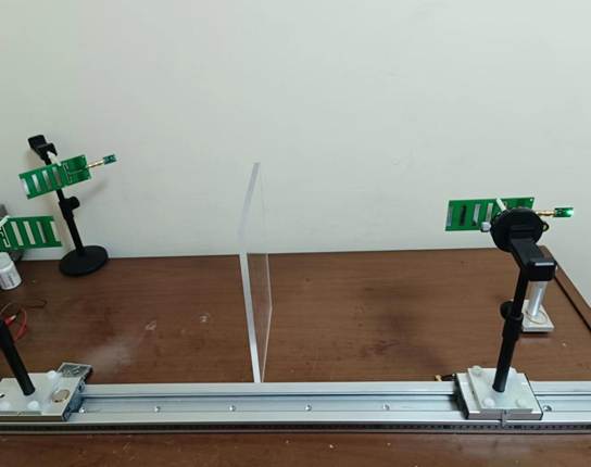 6)將有機(jī)玻璃平面放入收發(fā)天線(xiàn)中間,觀察LED燈的變化。