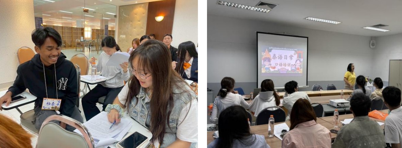 到達翁查瓦里功大學后,翁大老師首先給同學們開啟了泰語的啟蒙教學。從基礎會話到日常表達,老師以生動情境教學引導零基礎的同學快速融入。課堂互動中,同學們不僅掌握了實用語言技能,更通過語言載體感知泰國禮儀文化與社會風貌,為后續(xù)文化體驗活動奠定基礎。