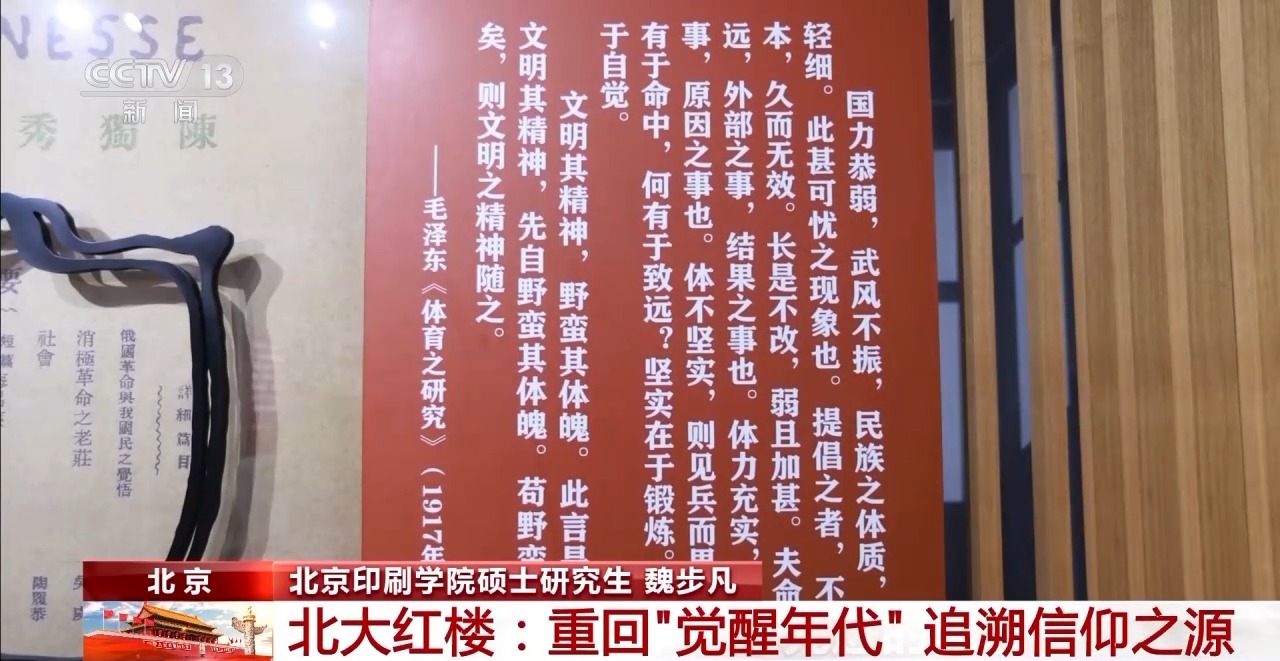 北京印刷學(xué)院碩士研究生 魏步凡:我印象比較深刻的,當(dāng)時(shí)發(fā)表在《新青年》上一篇毛澤東的文章就是《體育之研究》。當(dāng)時(shí)是陳獨(dú)秀提出了對(duì)新青年的6大標(biāo)準(zhǔn),青年時(shí)期毛澤東就覺得還應(yīng)該加入一個(gè)體育,所以發(fā)表文章說國風(fēng)羸弱,不能只在精神上進(jìn)行豐富,體魄也要進(jìn)一步加強(qiáng)。我覺得當(dāng)時(shí)是一個(gè)非常先進(jìn)的思想。