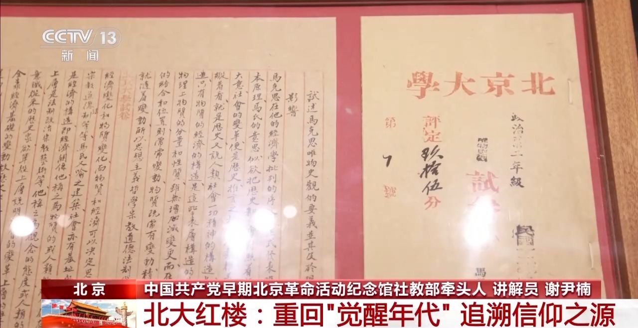 中國共產(chǎn)黨早期北京革命活動(dòng)紀(jì)念館社教部牽頭人 講解員 謝尹楠:這個(gè)是100多年前學(xué)生的試卷,當(dāng)時(shí)李大釗批閱北大哲學(xué)系學(xué)生唯物史觀的試卷,他也是中國最早將馬克思主義引進(jìn)中國高校課堂、引進(jìn)試卷的人,在封面上可以看到學(xué)生們都得到了不錯(cuò)的成績。