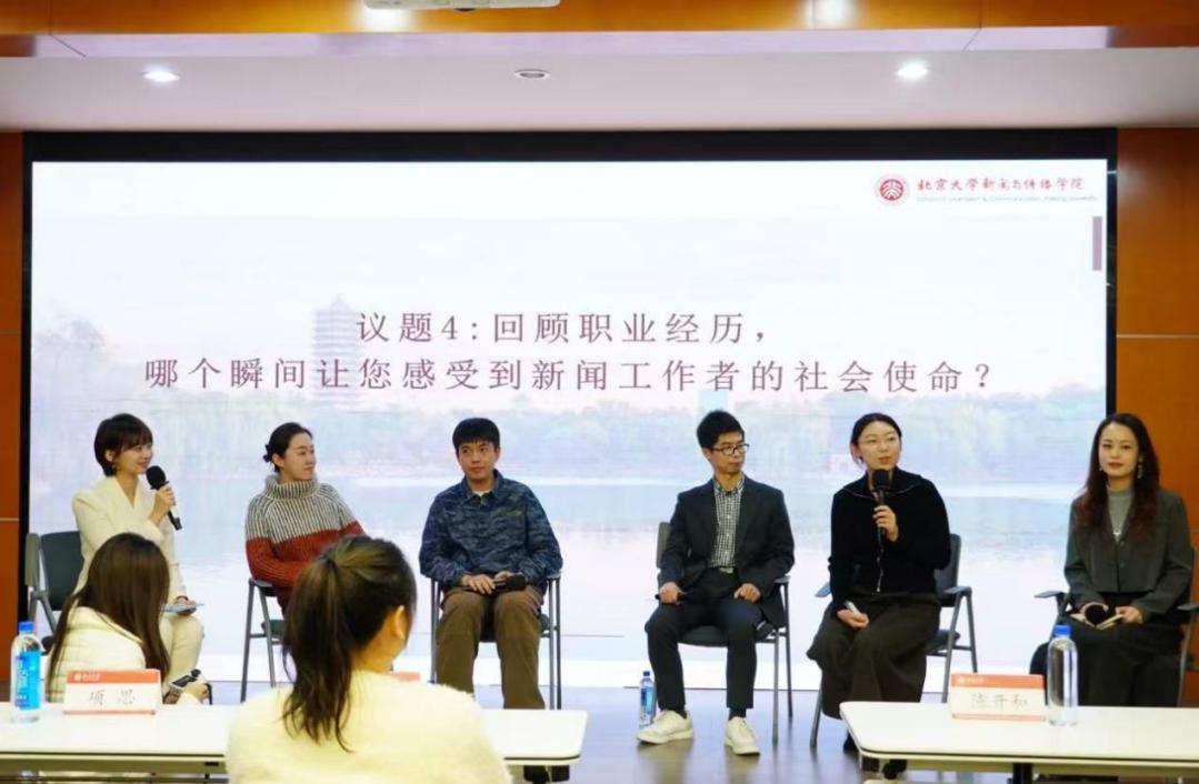 在圓桌論壇環(huán)節(jié),來自人民日報社、中央廣播電視總臺、中國日報社、《人民鐵道》報業(yè)有限公司的6位青年媒體從業(yè)者與同學(xué)們分享自己的職業(yè)經(jīng)歷和心得感悟。